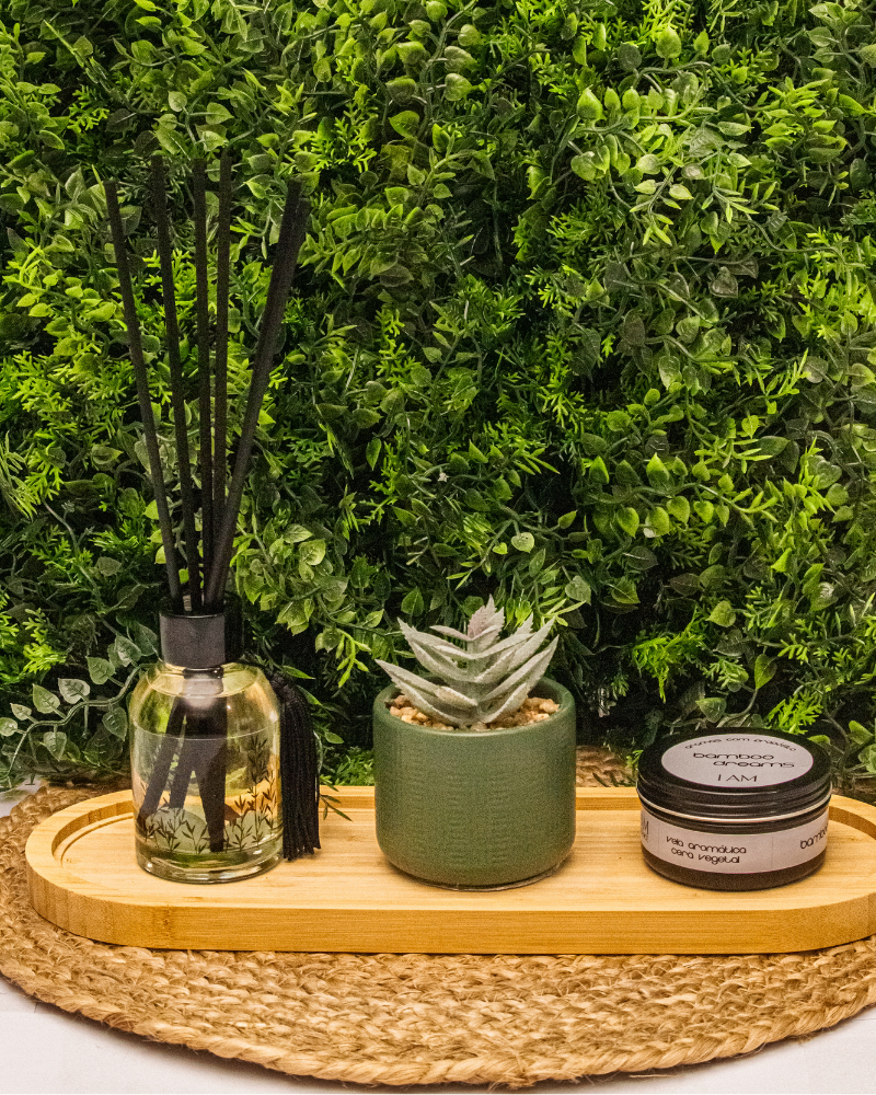 Nossa fragrância Green Bamboo é um aroma fresco e suave, tem a função de atrair positividade e auto confiança, ativa nossa memória olfativa a um adorável passeio no campo promovendo uma sensação de conforto e bem-estar.